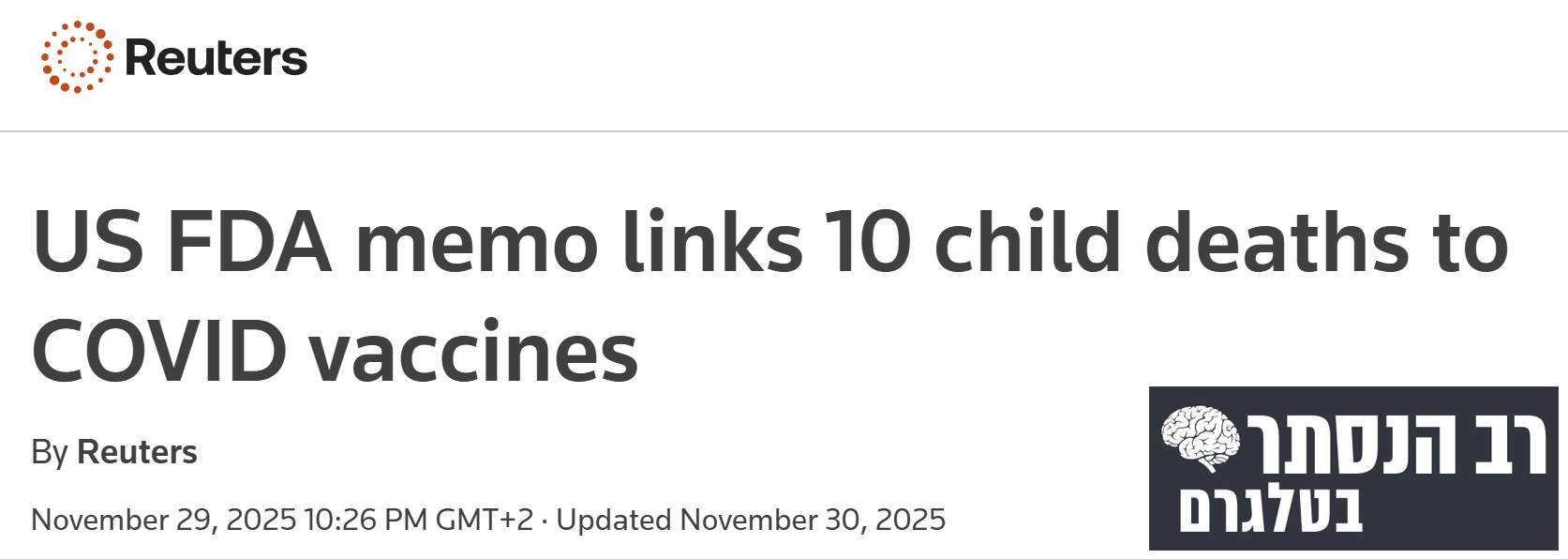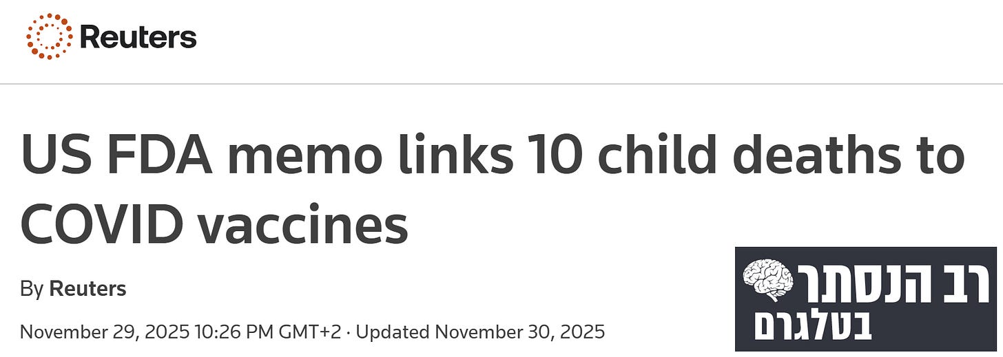 סוכנות הידיעות רויטרס: תזכיר של ה-אף.די.איי האמריקאי מקשר 10 מקרי מוות של ילדים לחיסוני קורונה