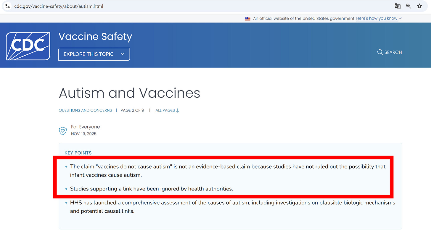 רעידת אדמה: ארגון ה-סי.די.סי הפך את עמדתו וכתב באתר הרשמי: הטענה ש"חיסונים אינם גורמים לאוטיזם" אינה טענה מבוססת ראיות משום שמחקרים לא שללו את האפשרות שחיסוני תינוקות גורמים לאוטיזם