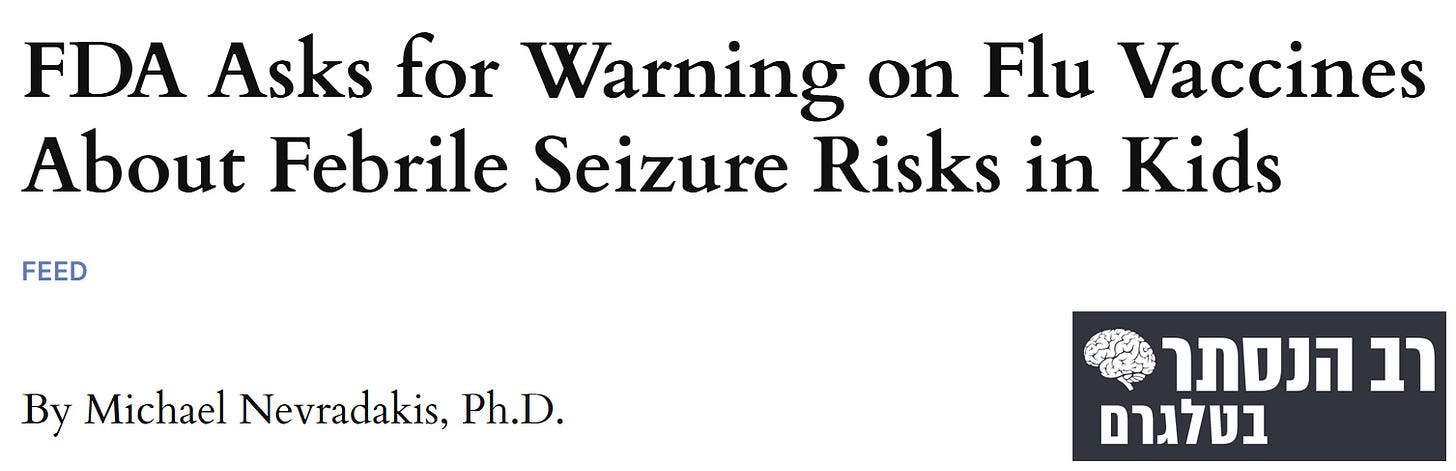 ארגון ה-FDA הציע את הנוסח הבא לתוויות בקבוקוני החיסונים: בשני מחקרי תצפית נפרדים לאחר שיווק נצפה סיכון מוגבר להתקפי פרכוסים במהלך היום הראשון לאחר חיסון שפעת טרי-וולנטי במינון סטנדרטי (2024-2025) וארבע-וולנטיים (2023-2024) בילדים בגילאי 6 חודשים עד 4 שנים.